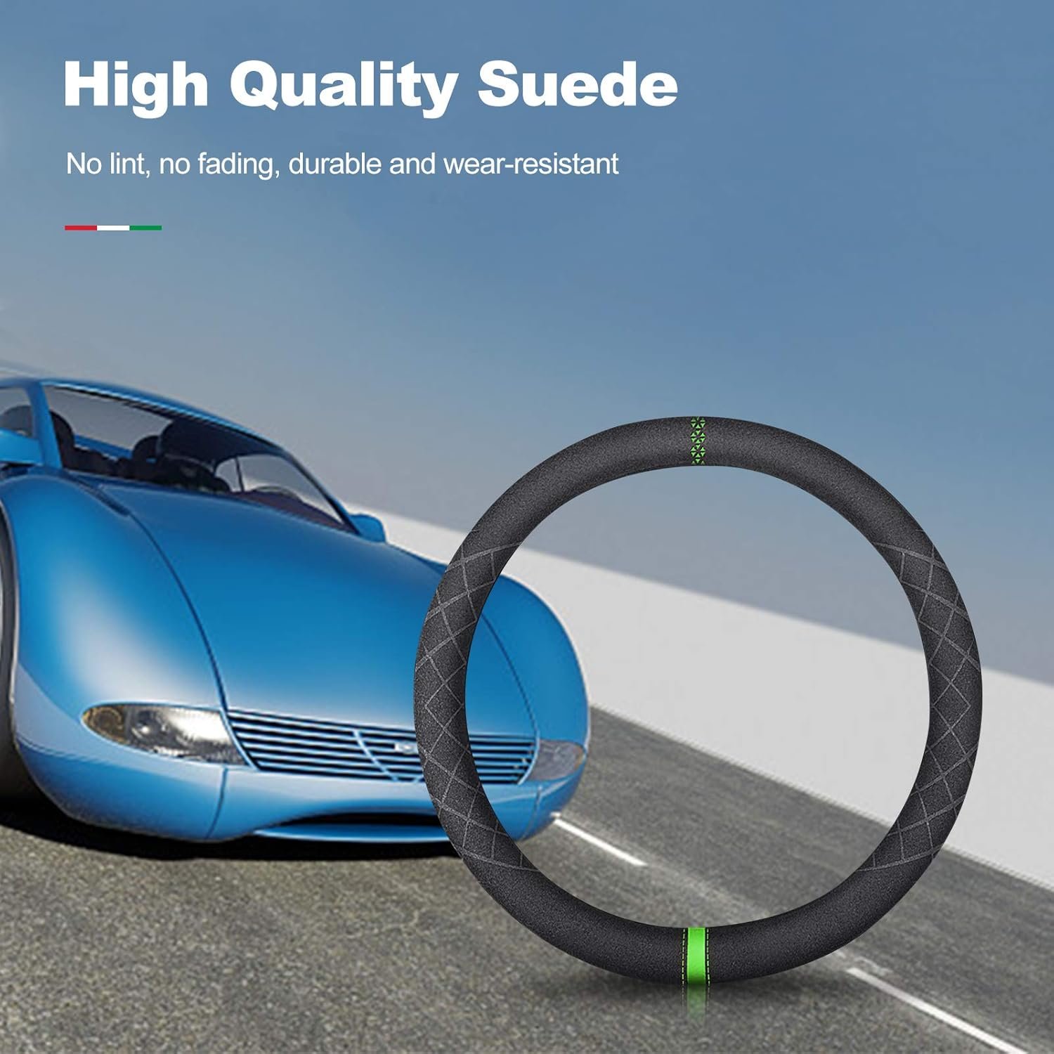 Sport Microfiber Suede Velvet Car Steering Wheel Cover Non-Slip Car Steering Wheel Protector Winter Warm Universal for Diameter 38cm(15″) (Black Green)